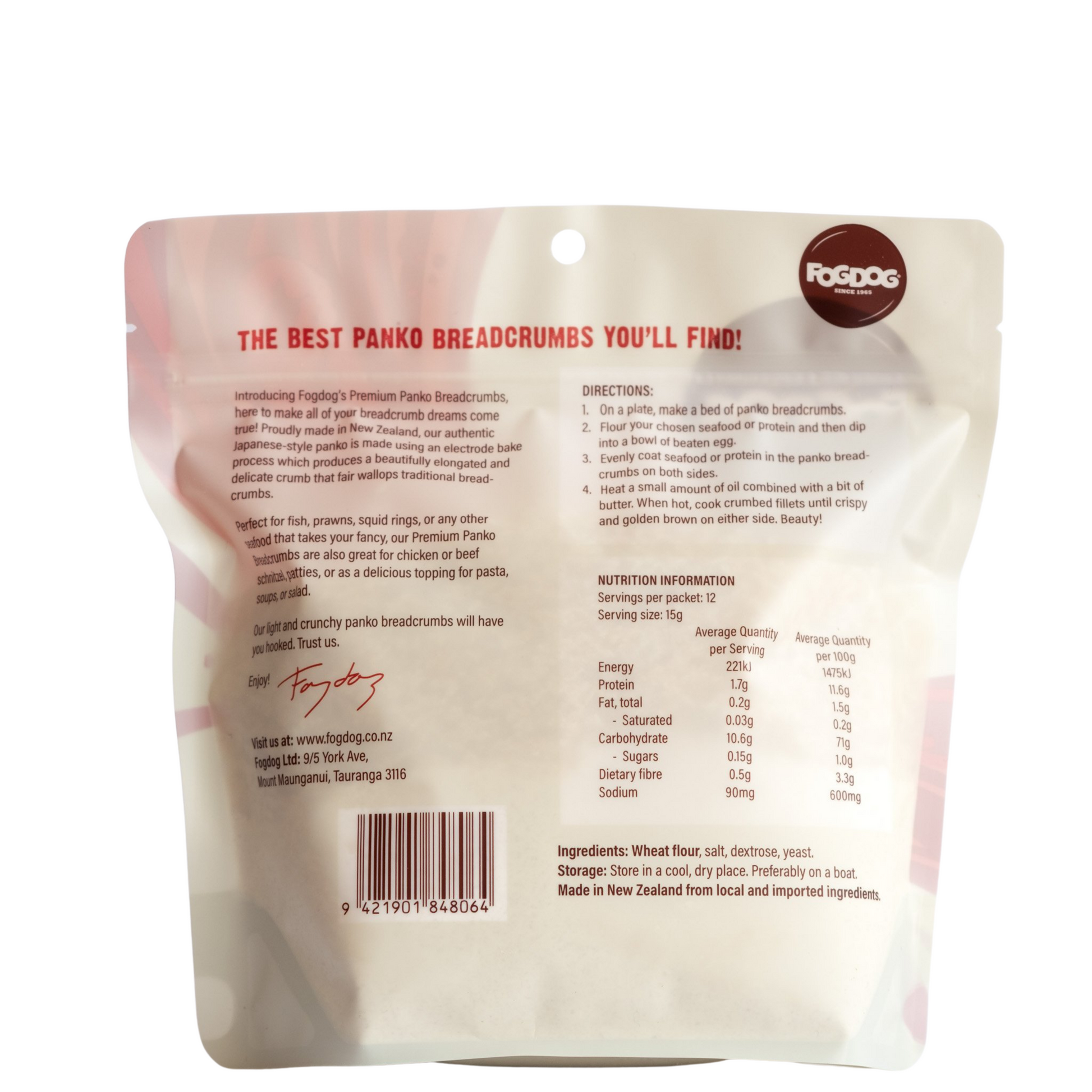 Introducing Fogdog’s Premium Panko Breadcrumbs, here to make all of your breadcrumb dreams come true! Proudly made in New Zealand, our authentic Japanese-style panko is made using an electrode bake process which produces a beautifully elongated and delicate crumb that fair wallops traditional breadcrumbs.